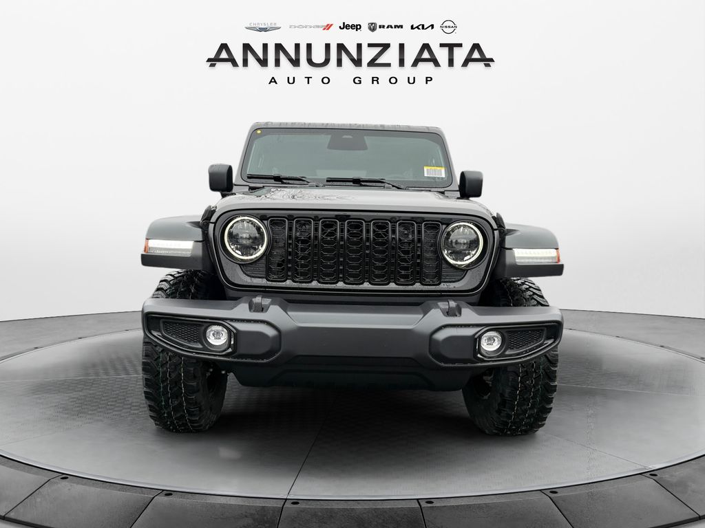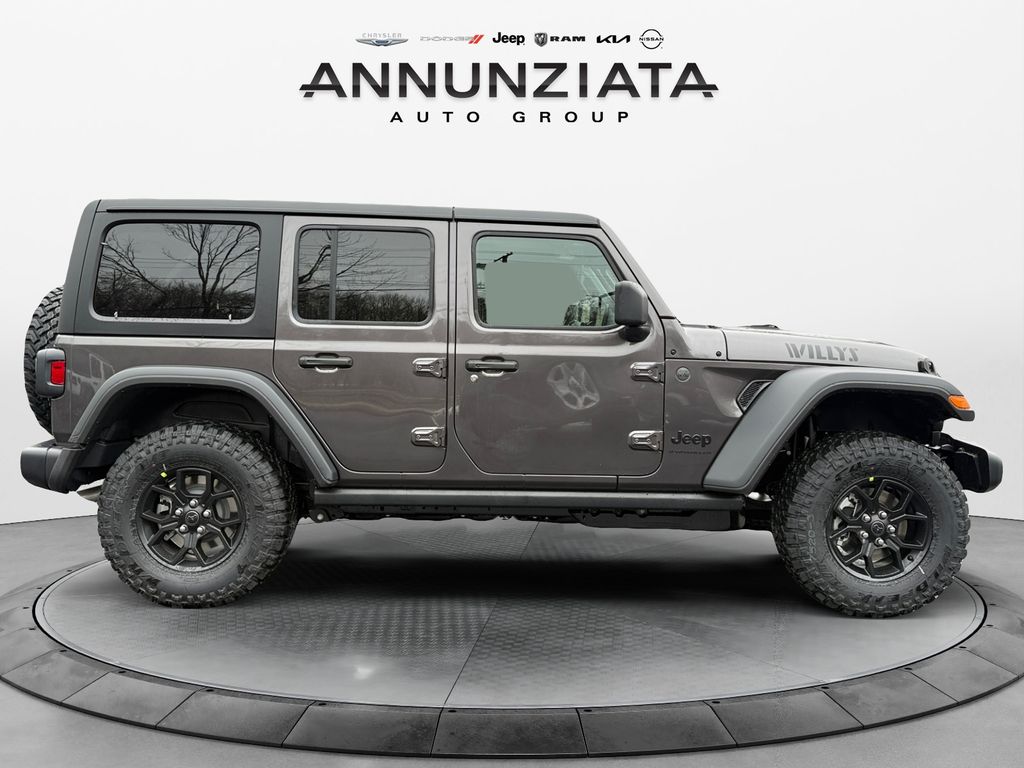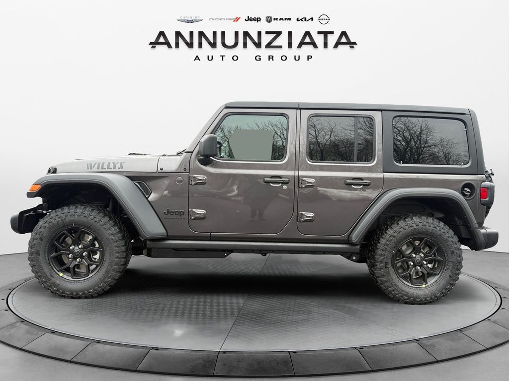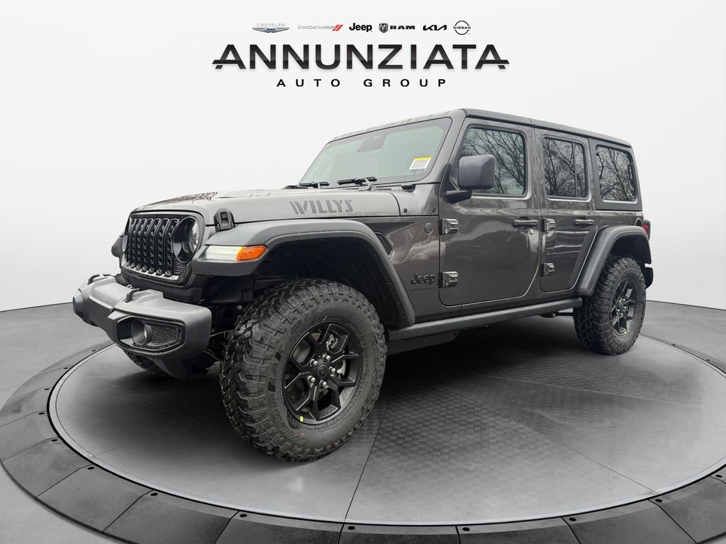 Convenience Group (2-Door Passive Entry, Front Door Locks, Air Conditioning with Auto Temp Control, Air Filtering, Cluster 7.0" TFT Color Display, Emergency/Assistance Call, Heated Front Seats, Heated Steering Wheel, and Universal Garage Door Opener), Quick Order Package 24W Willys (4-Wheel Drive Swing Gate Decal, 7 and 4 Pin Wiring Harness, Advanced Brake Assist, Automatic Headlamps, Auxiliary Switches, Black Grille with Gloss Black Rings, Class II Receiver Hitch, Conventional Differential Front Axle, Corning Gorilla Glass, Dana M210 Wide HD Tube Front Axle, Dana M220 Wide Rear Axle, Daytime Running Lamps LED Accents, Deep Tint Sunscreen Windows, E-Locker Rear Axle, Enhanced Adaptive Cruise Control, Front LED Fog Lamps, Full Speed Forward Collision Warning Plus, Increased Travel Export Tuned Suspension, Injection Molded Black Rear Bumper, LED Premium Reflector Headlamps, Mold in Color Bumper with Gloss Black, Molded in Color Rubicon Highline Flare, MOPAR All-Weather Floor Mats, Off-Road Plus Mode, Power Heated Mirrors, Premium Wrapped Steering Wheel, Security Alarm, Sun Visors with Illuminated Vanity Mirrors, Wheels: 17" x 7.5" Painted Black, and Willys Hood Decal), 12.3" Touchscreen Display, 4-Wheel Disc Brakes, 4G LTE Wi-Fi Hot Spot, 8 Speakers, ABS brakes, Air Conditioning, AM/FM radio: SiriusXM with 360L, Apple CarPlay, Apple CarPlay/Android Auto, Aux Battery, Black 3-Piece Hard Top, Brake assist, Compass, Connectivity - US/Canada, Delay-off headlights, Driver door bin, Driver vanity mirror, Dual front impact airbags, Dual front side impact airbags, Electronic Stability Control, For More Info, Call 800-643-2112, Freedom Panel Storage Bag, Front anti-roll bar, Front Bucket Seats, Front Center Armrest w/Storage, Front fog lights, Front reading lights, Google Android Auto, Illuminated entry, Integrated Center Stack Radio, Integrated roll-over protection, Jeep Trail Rated Kit, Low tire pressure warning, Myflexcare Service Plan, No Soft Top, Non-Lock Fuel Cap Without Discriminator, Normal Duty Suspension, Occupant sensing airbag, Outside temperature display, Overhead airbag, Panic alarm, ParkView Rear Back-Up Camera, Passenger door bin, Passenger vanity mirror, Power steering, Power windows, Radio data system, Radio: Uconnect 5 with 12.3" Display, Rear anti-roll bar, Rear reading lights, Rear Window Defroster, Rear Window Wiper/Washer, Remote keyless entry, SiriusXM Radio Service, SiriusXM with 360L, Speed control, Split folding rear seat, Steering wheel mounted audio controls, Stop-Start Dual Battery System, Tachometer, Telescoping steering wheel, Tilt steering wheel, Traction control, Trip computer, Variably intermittent wipers, and Wheels: 17" x 7.5" Black Steel Styled.