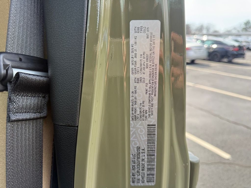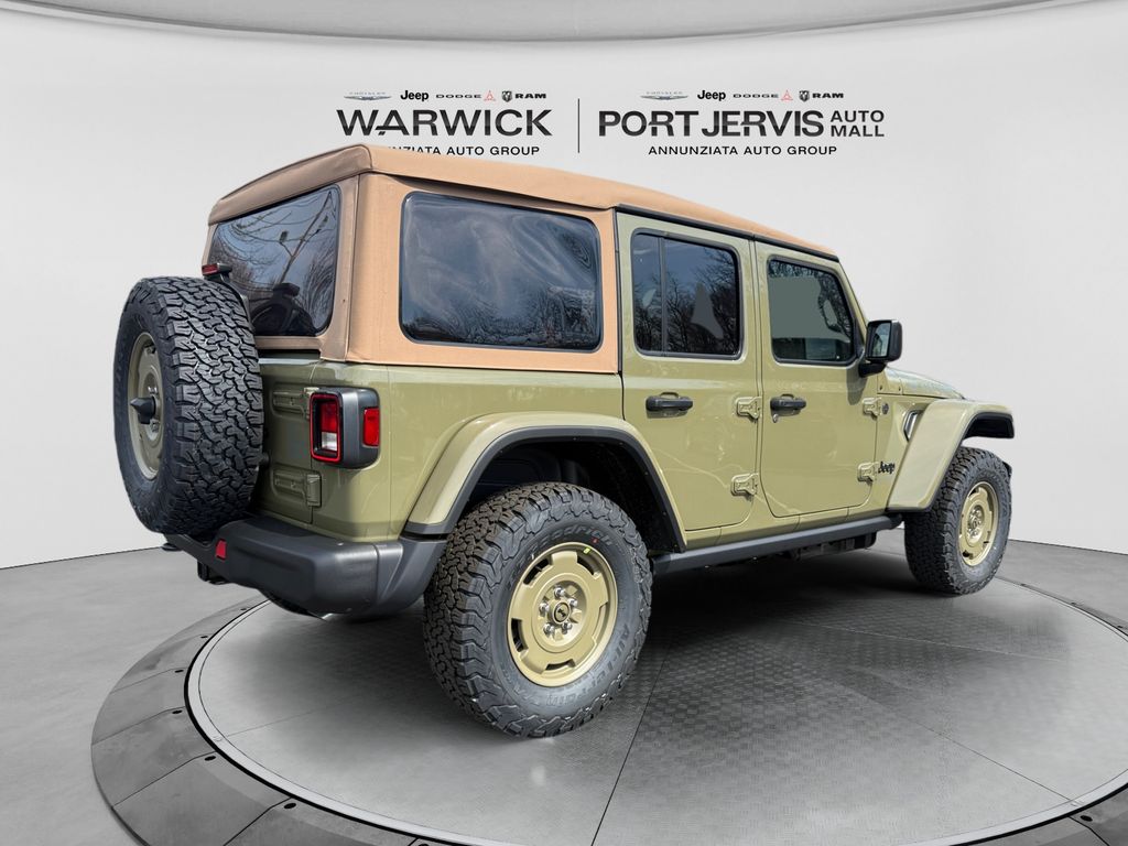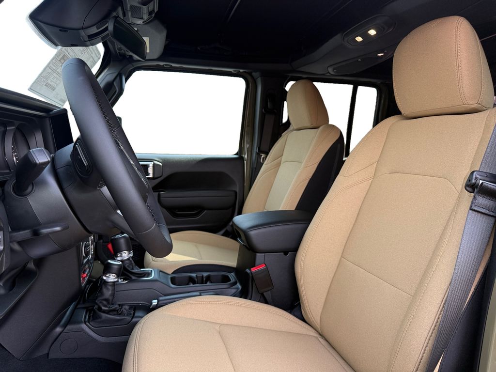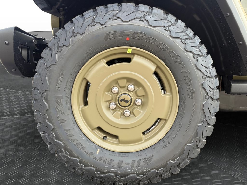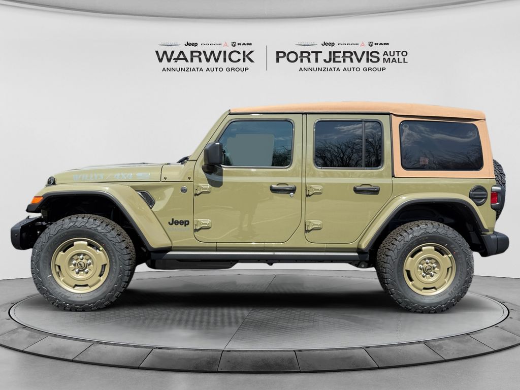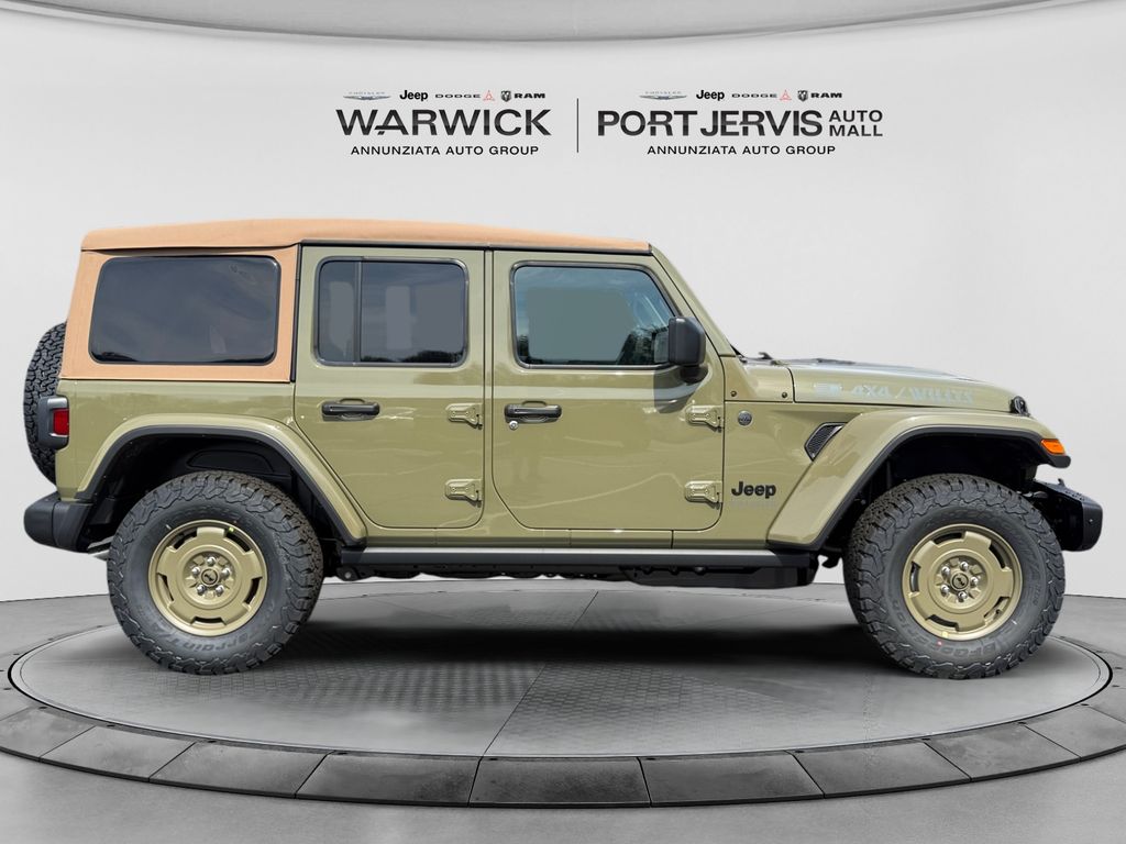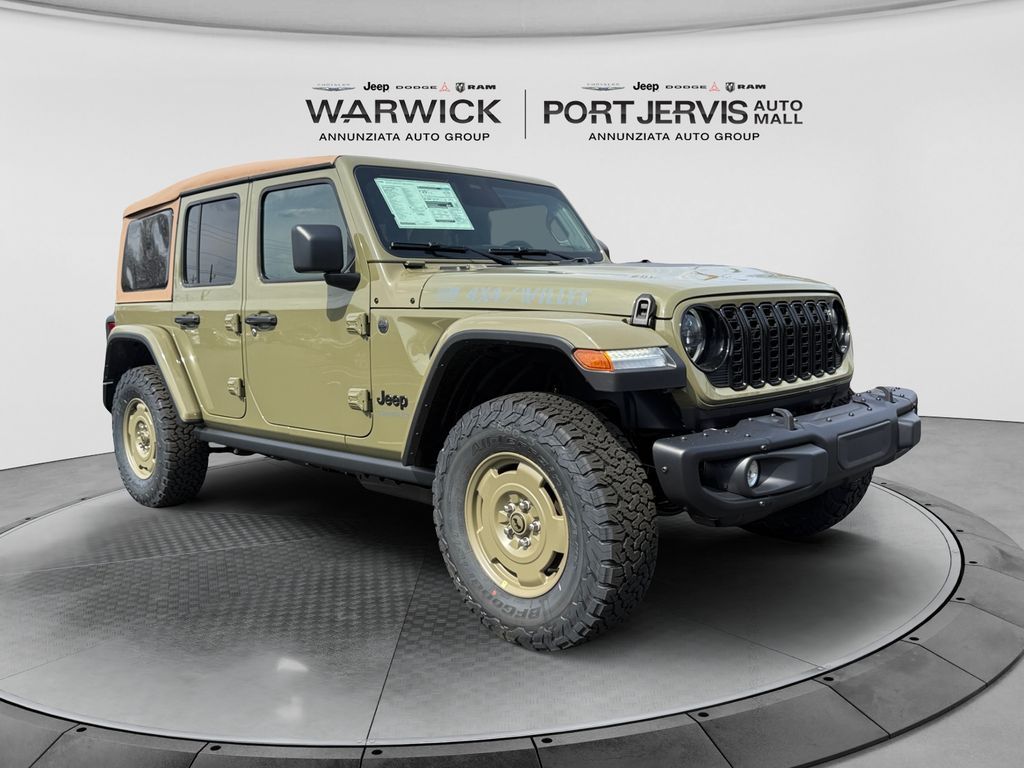 Convenience Group (2-Door Passive Entry, Front Door Locks, Air Conditioning with Auto Temp Control, Air Filtering, Cluster 7.0" TFT Color Display, Emergency/Assistance Call, Heated Front Seats, Heated Steering Wheel, and Universal Garage Door Opener), Quick Order Package 24H Willys 41 (4WD Willys '41 Swing Gate Decal, 7 and 4 Pin Wiring Harness, 97 MPH Vehicle Max Speed Calibration, Adaptive Cruise Control with Stop, Advanced Brake Assist, Automatic Headlamps, Auxiliary Switches, Body Color Grille with Gloss Black Rings, Body Color Rubicon Highline Flare, Class II Receiver Hitch, Cloth Low-Back Bucket Seats, Conventional Differential Front Axle, Corning Gorilla Glass, Dana M210 Wide HD Tube Front Axle, Dana M220 Wide Rear Axle, Daytime Running Lamps LED Accents, Deep Tint Sunscreen Windows, E-Locker Rear Axle, Front LED Fog Lamps, Full Speed Forward Collision Warning Plus, Increased Travel Export Tuned Suspension, LED Premium Reflector Headlamps, MOPAR All-Weather Floor Mats, Off-Road Plus Mode, Power Heated Mirrors, Premium Tan Sunrider Soft Top, Premium Wrapped Steering Wheel, Security Alarm, Steel Front Bumper, Steel Rear Bumper, Sun Visors with Illuminated Vanity Mirrors, Wheels: 17" x 7.5" Fully Painted, Willys '41 Retro Edition Buzz Model, Willys '41 Retro Edition Hood Decal, Willys '41 Retro Edition Tailgate Plaque, Willys '41 Retro Edition Wrangler Decal, Willys '41 Retro Shift Bezel Insert, and Willys '41 US Edition U.S. Hood Decal), Steel Power Dome Hood Package (Power Dome Dual Vented Hood), 12.3" Touchscreen Display, 4-Wheel Disc Brakes, 4G LTE Wi-Fi Hot Spot, 8 Speakers, ABS brakes, Air Conditioning, AM/FM radio: SiriusXM with 360L, Apple CarPlay, Apple CarPlay/Android Auto, Aux Battery, Brake assist, Compass, Connectivity - US/Canada, Delay-off headlights, Driver door bin, Driver vanity mirror, Dual front impact airbags, Dual front side impact airbags, Electronic Stability Control, For More Info, Call 800-643-2112, Front anti-roll bar, Front Bucket Seats, Front Center Armrest w/Storage, Front fog lights, Front reading lights, Google Android Auto, Illuminated entry, Integrated Center Stack Radio, Integrated roll-over protection, Low tire pressure warning, Non-Lock Fuel Cap Without Discriminator, Normal Duty Suspension, Occupant sensing airbag, Outside temperature display, Overhead airbag, Panic alarm, ParkView Rear Back-Up Camera, Passenger door bin, Passenger vanity mirror, Power steering, Power windows, Radio data system, Radio: Uconnect 5 with 12.3" Display, Rear anti-roll bar, Rear reading lights, Remote keyless entry, SiriusXM Radio Service, SiriusXM with 360L, Speed control, Split folding rear seat, Steering wheel mounted audio controls, Stop-Start Dual Battery System, Tachometer, Telescoping steering wheel, Tilt steering wheel, Traction control, Trip computer, Variably intermittent wipers, and Wheels: 17" x 7.5" Black Steel Styled.