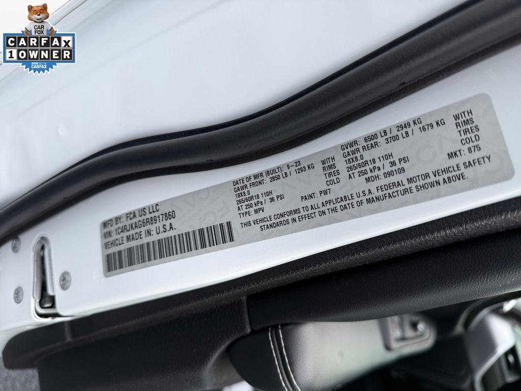 Luxury Tech Group I (115V Auxiliary Power Outlet, 3rd Row Charge-Only USB Ports, Heated Front Seats, Heated Steering Wheel, Power Liftgate, Rain Sensitive Windshield Wipers, Remote Start System, Selectable Tire Fill Alert, and Wireless Charging Pad), Quick Order Package 23A Laredo, FCA US LLC Certified Pre-Owned Certified, 3.45 Rear Axle Ratio, 3rd row seats: split-bench, 4-Wheel Disc Brakes, 6 Speakers, ABS brakes, Air Conditioning, Alloy wheels, Anti-whiplash front head restraints, Automatic temperature control, Brake assist, Bumpers: body-color, Cloth Seats, Compass, Delay-off headlights, Driver door bin, Driver vanity mirror, Dual front impact airbags, Dual front side impact airbags, Electronic Stability Control, Emergency communication system, Four wheel independent suspension, Front anti-roll bar, Front Bucket Seats, Front Center Armrest w/Storage, Front dual zone A/C, Front License Plate Bracket, Front reading lights, Fully automatic headlights, Heated door mirrors, Illuminated entry, Knee airbag, Low tire pressure warning, Manual Fold Seatbacks, Normal Duty Suspension, Occupant sensing airbag, Outside temperature display, Overhead airbag, Overhead console, Panic alarm, ParkView Rear Back-Up Camera, Passenger door bin, Passenger vanity mirror, Power door mirrors, Power driver seat, Power steering, Power windows, Radio data system, Radio: Uconnect 5 w/8.4" Display, Rear air conditioning, Rear anti-roll bar, Rear reading lights, Rear window defroster, Rear window wiper, Reclining 3rd row seat, Remote keyless entry, Security system, Speed control, Speed-Sensitive Wipers, Split folding rear seat, Spoiler, Steering wheel mounted audio controls, Tachometer, Telescoping steering wheel, Tilt steering wheel, Traction control, Trip computer, Variably intermittent wipers, Voltmeter, and Wheels: 18" x 8.0" Fully Painted Aluminum.
